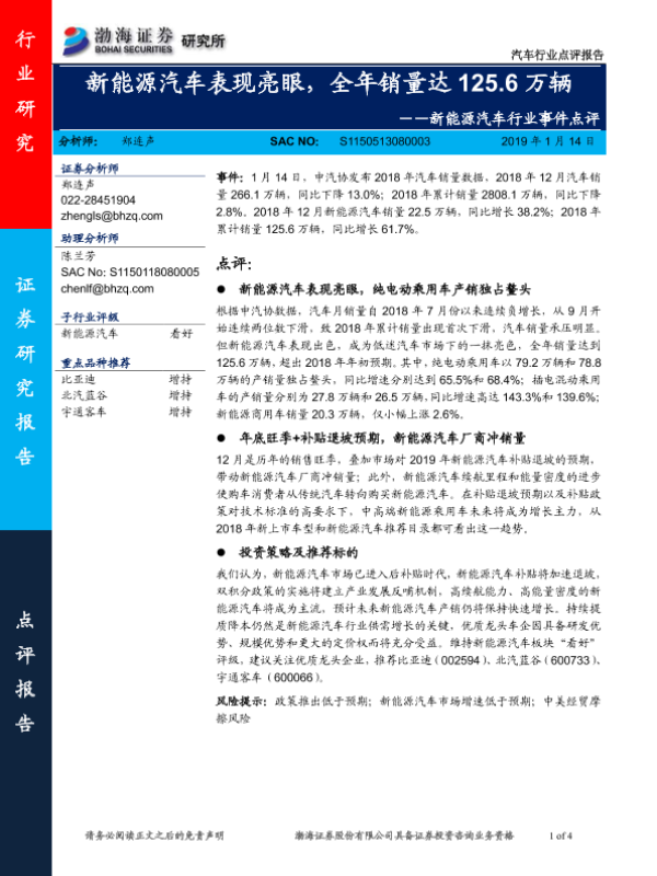 【渤海证券】【20190114】新能源汽车行业事件点评:新能源汽车表现亮眼,全年销量达125.6万辆-4页