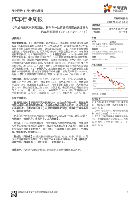 【天风证券】【20190113】20190113-天风证券-汽车行业周报:今年或将出汽车刺激新政,新能车补贴将分阶段释放退坡压力-26页