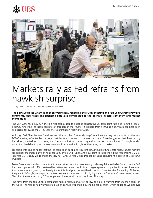 【UBS Editorial Team】【20220727】Markets rally as Fed refrains from hawkish surprise-2页