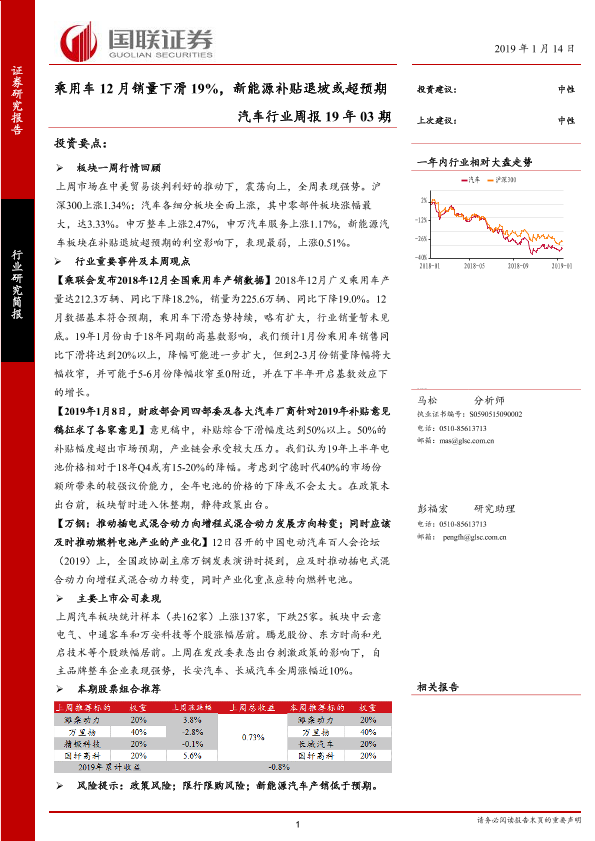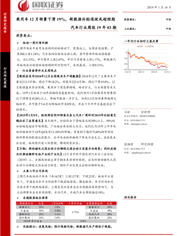 【国联证券】【20190114】20190114-国联证券-汽车行业周报19年03期:乘用车12月销量下滑19%,新能源补贴退坡或超预期-17页