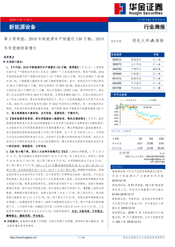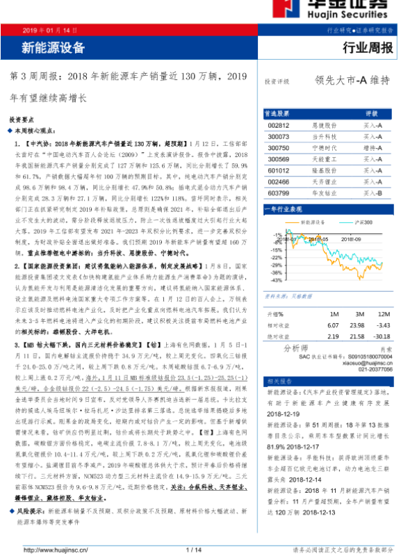 【华金证券】【20190114】20190114-华金证券-新能源设备第3周周报:2018年新能源车产销量近130万辆,2019年有望继续高增长-14页