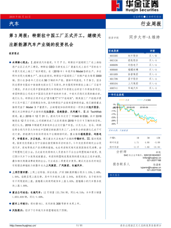 【华金证券】【20190114】20190114-华金证券-汽车第3周报:特斯拉中国工厂正式开工,继续关注新能源汽车产业链的投资机会-11页