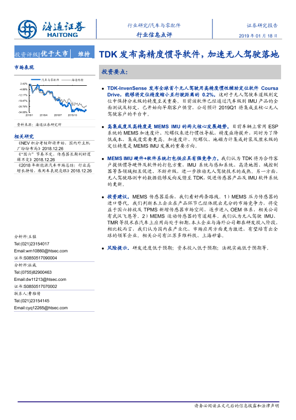 【海通证券】【20190118】汽车与零配件行业信息点评:TDK发布高精度惯导软件,加速无人驾驶落地-5页