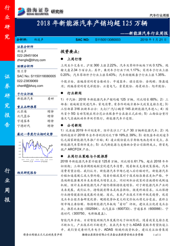 【渤海证券】【20190121】20190121-渤海证券-新能源汽车行业周报:2018年新能源汽车产销均超125万辆-11页