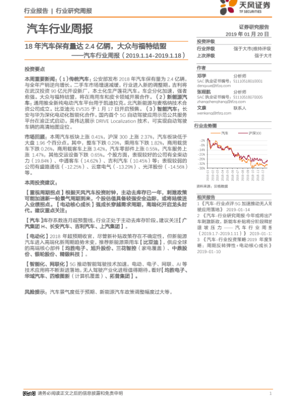【天风证券】【20190120】20190120-天风证券-汽车行业周报:18年汽车保有量达2.4亿辆,大众与福特结盟-25页