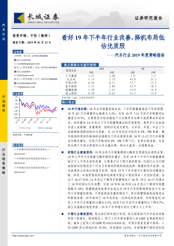 【长城证券】【20190122】汽车行业2019年度策略报告:看好19年下半年行业改善,择机布局低估优质股-56页