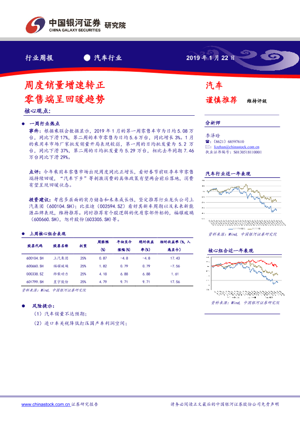 【银河证券】【20190122】20190122-中国银河-汽车行业周报:周度销量增速转正 零售端呈回暖趋势-19页