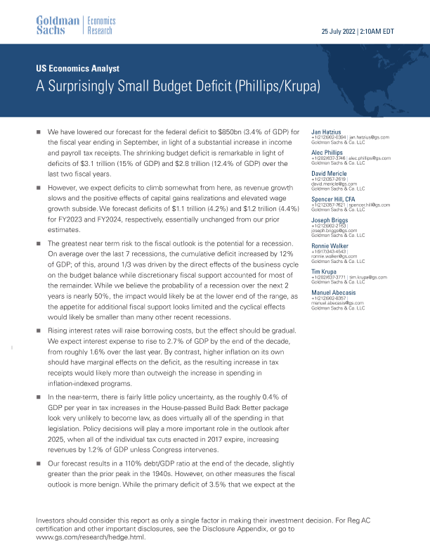 【Goldman Sachs】【20220725】S Economics Analyst_ A Surprisingly Small Budget Deficit-13页