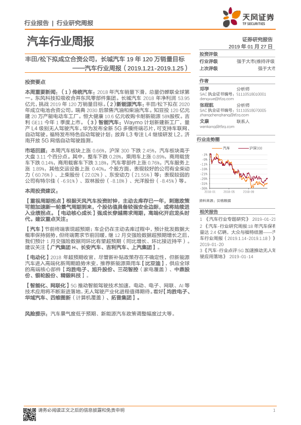 【天风证券】【20190127】20190127-天风证券-汽车行业周报:丰田 松下拟成立合资公司,长城汽车19年120万销量目标-24页