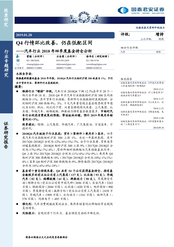 【国泰君安证券】【20190128】汽车行业2018年四季度基金持仓分析:Q4行情环比改善,仍在低配区间-8页