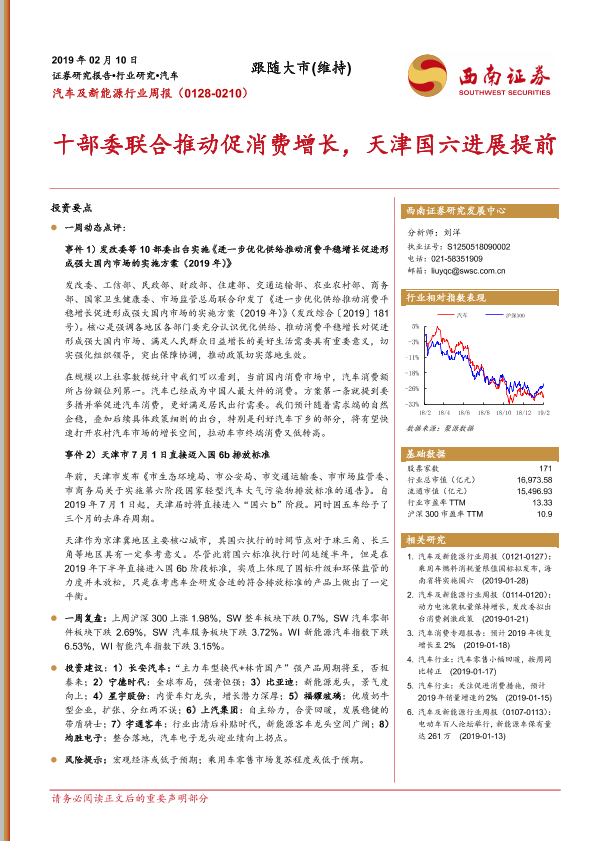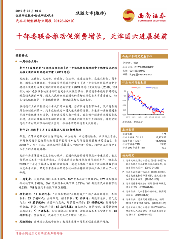 【西南证券】【20190210】汽车及新能源行业周报:十部委联合推动促消费增长,天津国六进展提前-15页