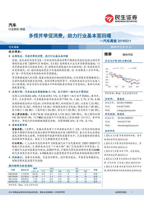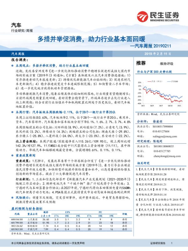 【民生证券】【20190211】20190211-民生证券-汽车周报:多措并举促消费,助力行业基本面回暖-24页