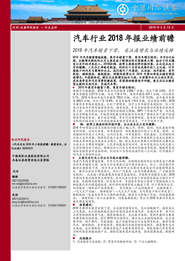 【中银证券】【20190213】汽车行业2018年报业绩前瞻:2018年汽车销量下滑,关注高增长与业绩反转-12页