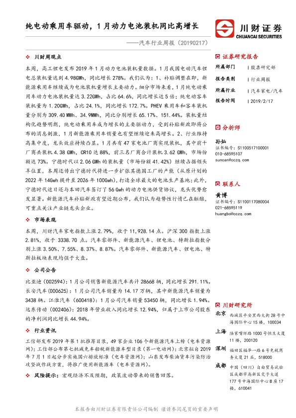 【川财证券】【20190217】20190217-川财证券-汽车行业周报:纯电动乘用车驱动,1月动力电池装机同比高增长-11页
