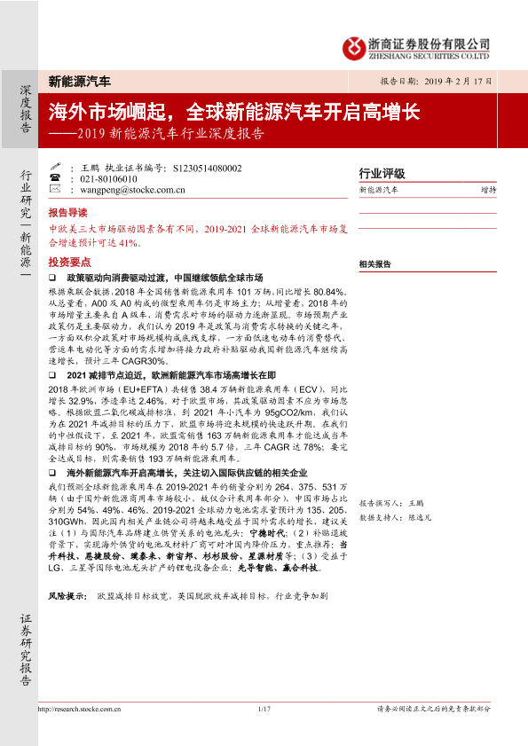 【浙商证券】【20190217】2019新能源汽车行业深度报告:海外市场崛起,全球新能源汽车开启高增长-17页