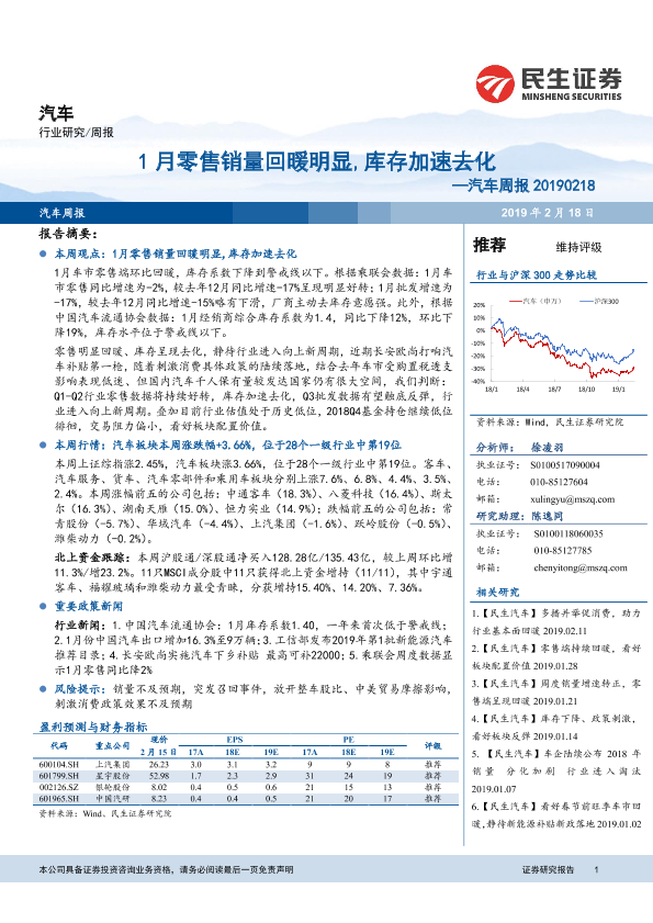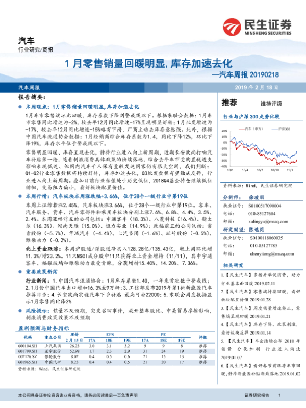 【民生证券】【20190218】20190218-民生证券-汽车周报:1月零售销量回暖明显,库存加速去化-17页