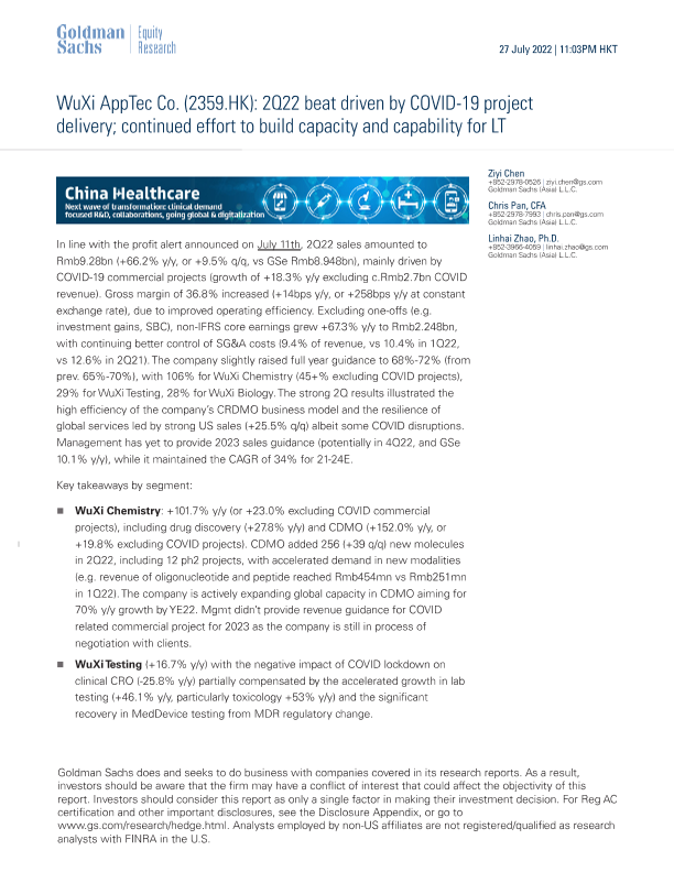 【Goldman Sachs】【20220727】WuXi AppTec Co.(2359.HK) 2Q22 beat driven by COVID-19 project delivery; continued effort to build capacity and capability for LT-5页