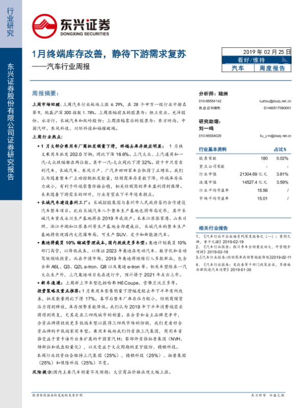 【东兴证券】【20190225】20190225-东兴证券-汽车行业周报:1月终端库存改善,静待下游需求复苏-19页