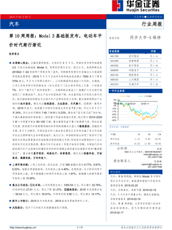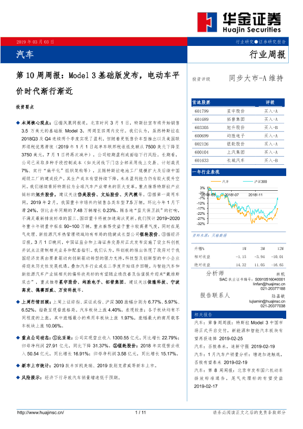 【华金证券】【20190303】汽车第10周周报:Model 3基础版发布,电动车平价时代渐行渐近-11页