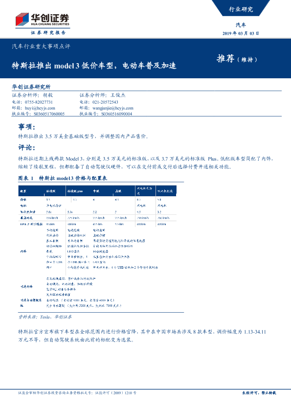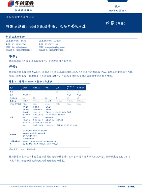 【华创证券】【20190303】汽车行业重大事项点评:特斯拉推出model 3低价车型,电动车普及加速-4页