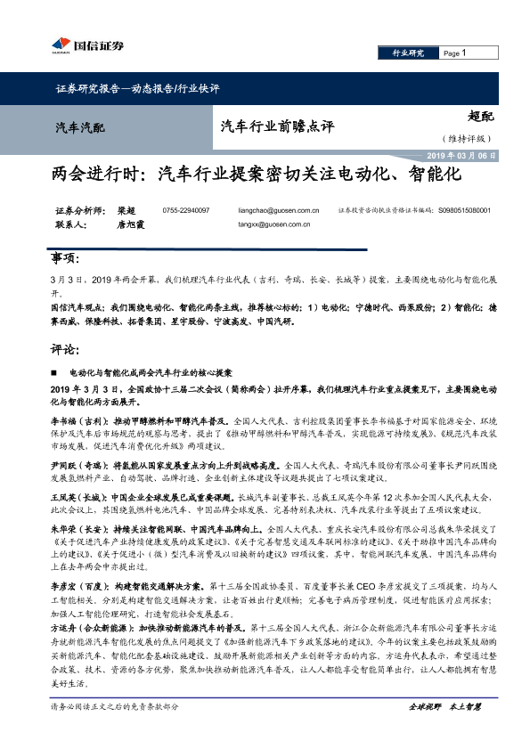 【国信证券】【20190306】汽车行业前瞻点评:两会进行时:汽车行业提案密切关注电动化、智能化-9页