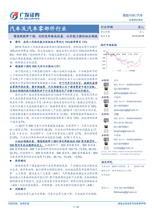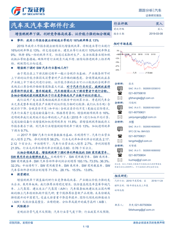 【广发证券】【20190308】汽车及汽车零部件:增值税税率下调,利好竞争格局改善、议价能力强的细分领域-12页
