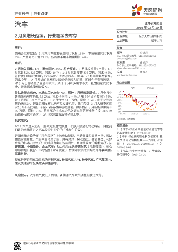 【天风证券】【20190310】20190310-天风证券-汽车行业点评:2月负增长延续,行业继续去库存-11页