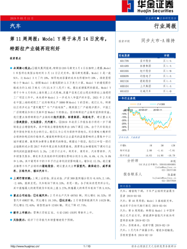 【华金证券】【20190311】汽车第11周周报:Model Y将于本月14日发布,特斯拉产业链再迎利好-10页