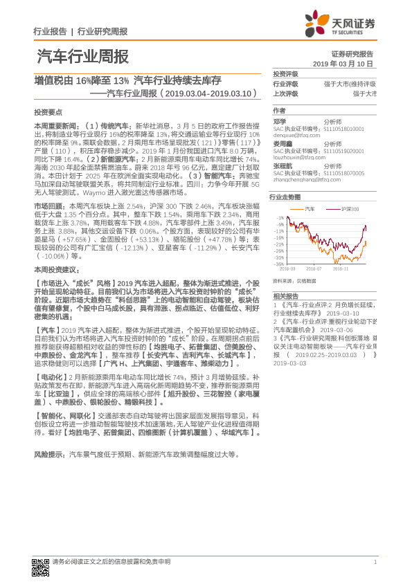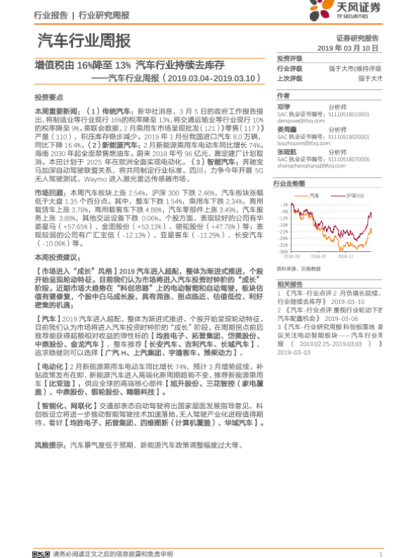 【天风证券】【20190310】20190310-天风证券-汽车行业周报:增值税由16%降至13% 汽车行业持续去库存-26页