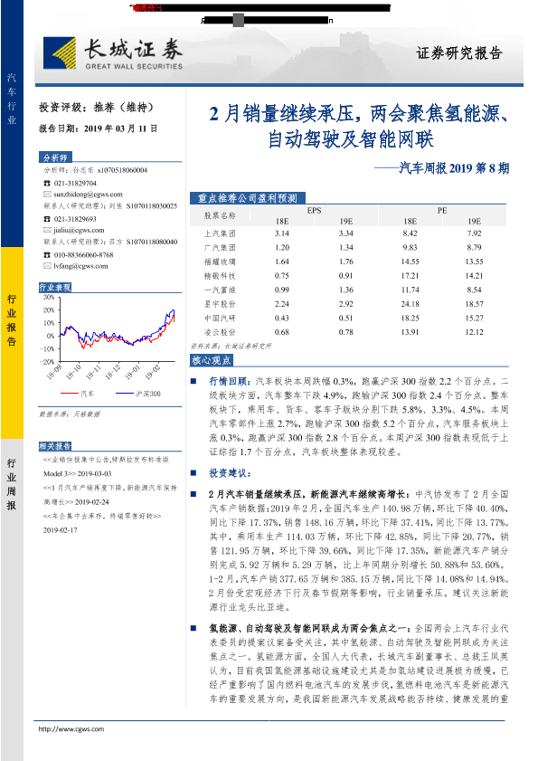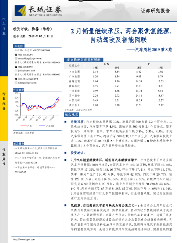 【长城证券】【20190311】汽车行业周报2019第8期:2月销量继续承压,两会聚焦氢能源、自动驾驶及智能网联-13页