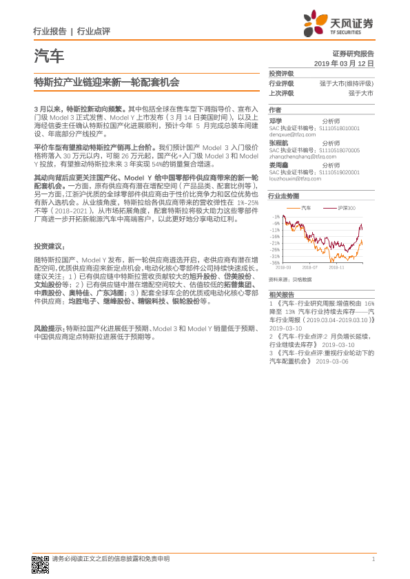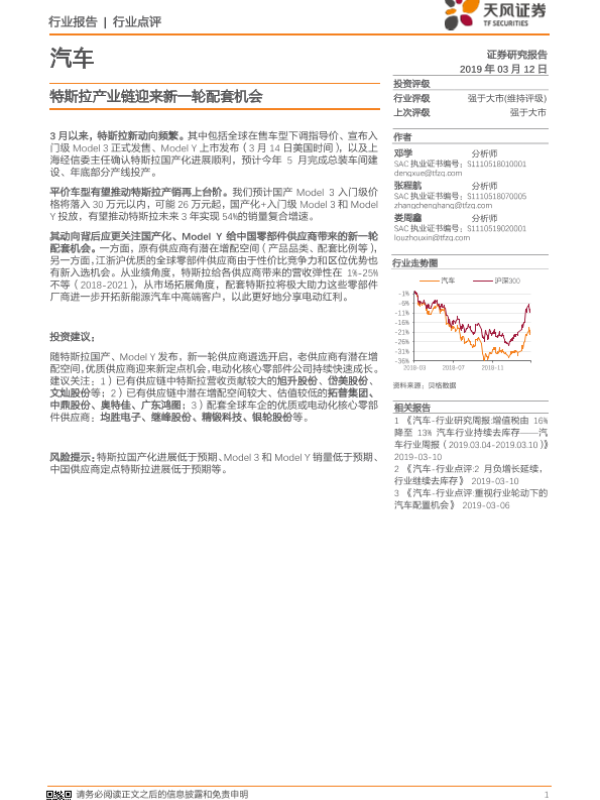 【天风证券】【20190312】汽车行业点评:特斯拉产业链迎来新一轮配套机会-13页