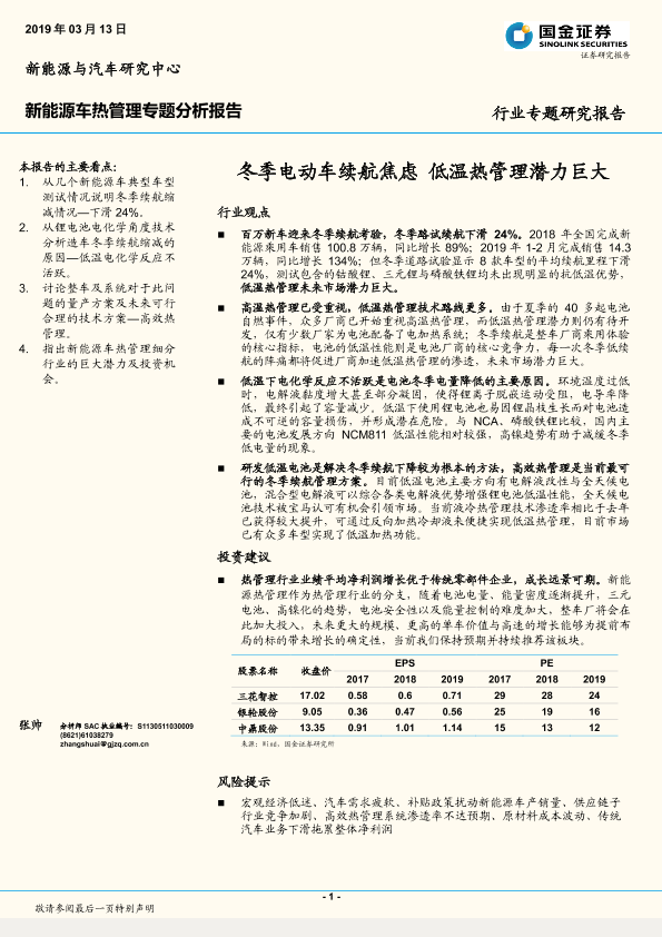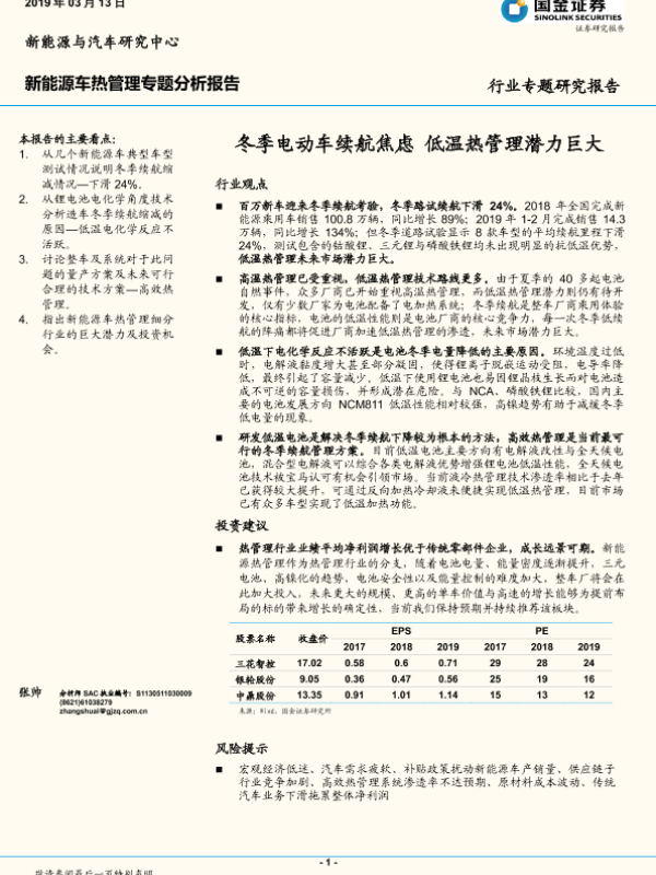 【国金证券】【20190313】20190313-国金证券-新能源车热管理专题分析报告:冬季电动车续航焦虑 低温热管理潜力巨大-15页