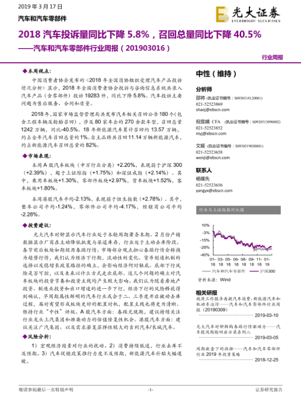 【光大证券】【20190317】20190317-光大证券-汽车和汽车零部件行业周报:2018汽车投诉量同比下降5.8%,召回总量同比下降40.5%-14页