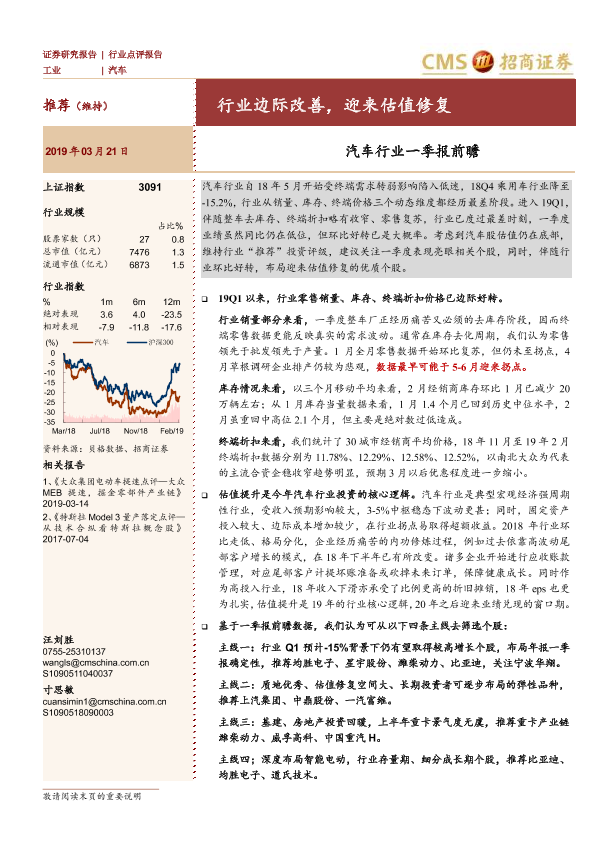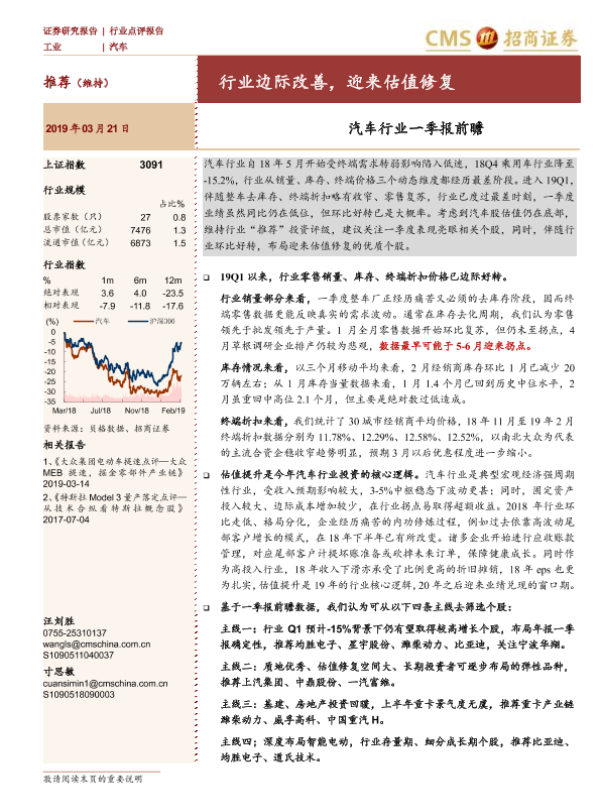 【海通证券】【20190321】20190321-招商证券-汽车行业一季报前瞻:行业边际改善,迎来估值修复-10页