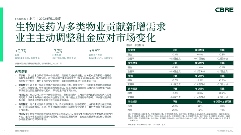 【世邦魏理仕研究部】【202207】生物医药为多类物业贡献新增需求-业主主动调整租金应对市场变化-7页