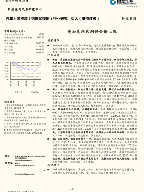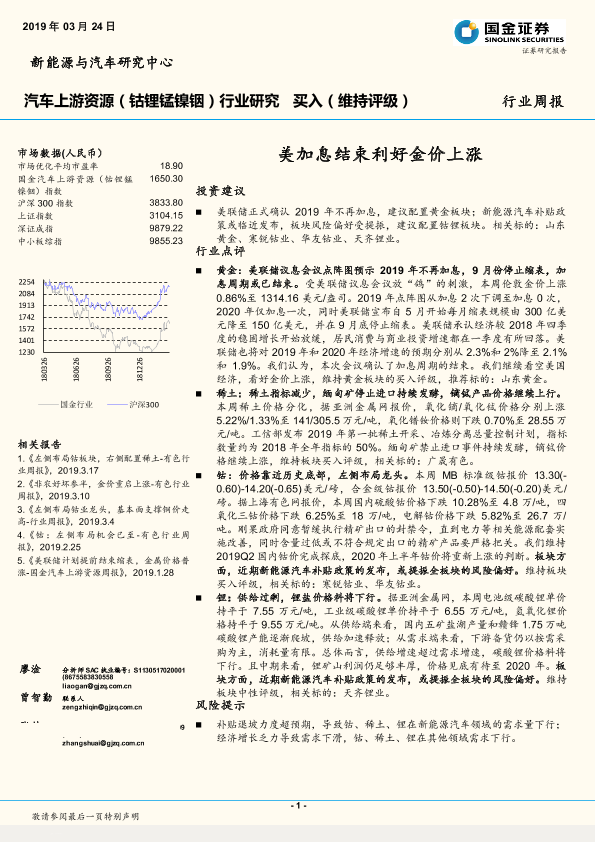 【国金证券】【20190324】20190324-国金证券-汽车上游资源(钴锂锰镍铟)行业研究周报:美加息结束利好金价上涨-9页