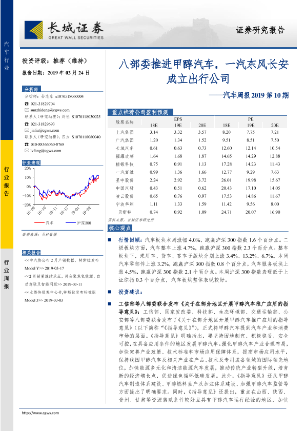 【长城证券】【20190324】20190324-长城证券-汽车行业周报2019第10期:八部委推进甲醇汽车,一汽东风长安成立出行公司-13页