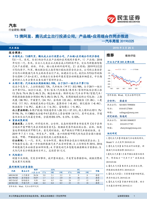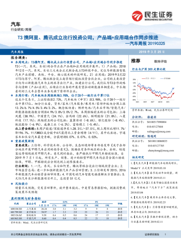 【民生证券】【20190325】汽车周报:T3携阿里、腾讯成立出行投资公司,产品端+应用端合作同步推进-18页