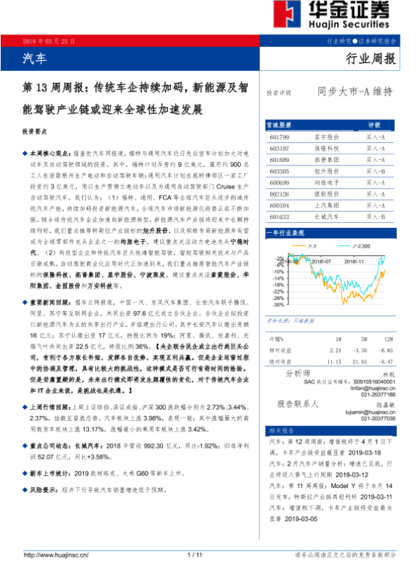 【华金证券】【20190325】汽车第13周周报:传统车企持续加码,新能源及智能驾驶产业链或迎来全球性加速发展-11页