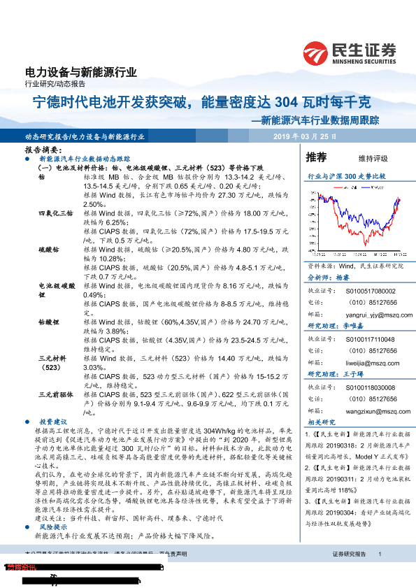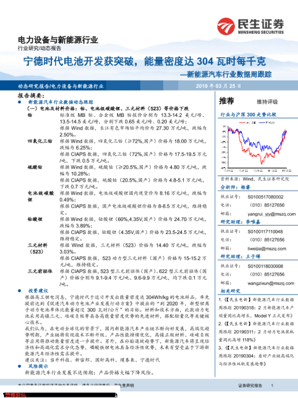 【民生证券】【20190325】20190325-民生证券-新能源汽车行业数据周跟:宁德时代电池开发获突破,能量密度达304瓦时每千克-11页