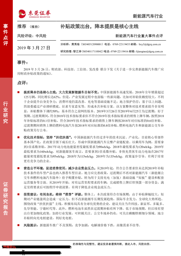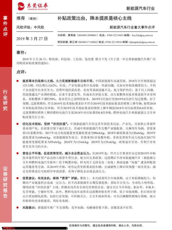 【东莞证券】【20190327】新能源汽车行业重大事件点评:补贴政策出台,降本提质是核心主线-3页