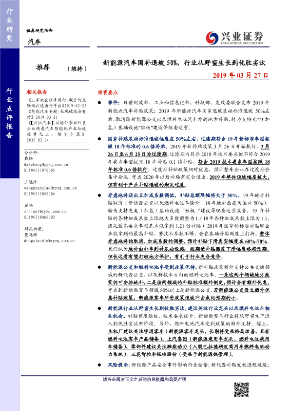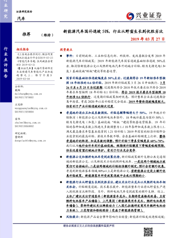 【兴业证券】【20190327】新能源汽车国补退坡50%,行业从野蛮生长到优胜劣汰-4页