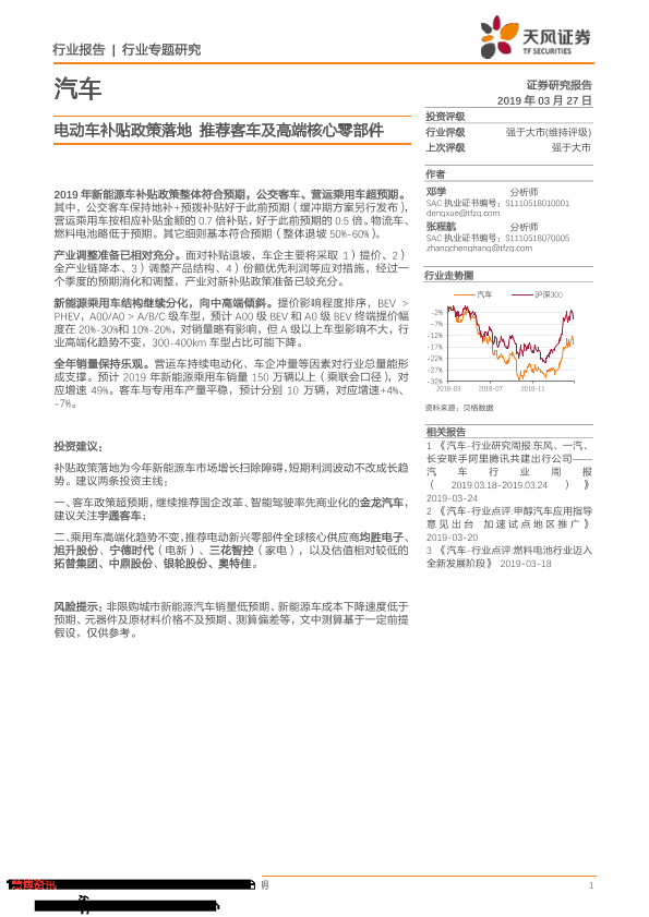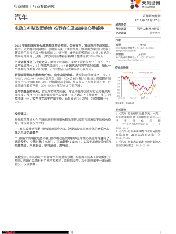 【天风证券】【20190327】20190327-天风证券-汽车行业专题研究:电动车补贴政策落地 推荐客车及高端核心零部件-12页