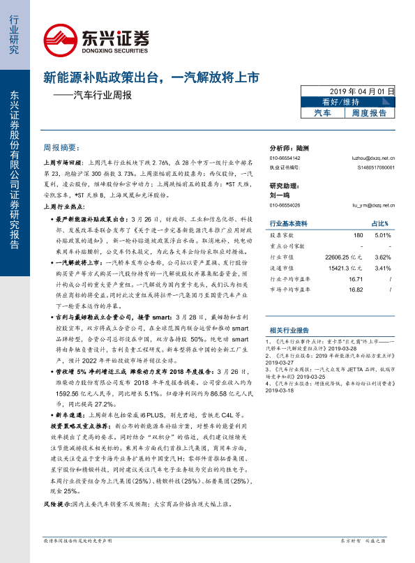 【东兴证券】【20190401】20190401-东兴证券-汽车行业周报:新能源补贴政策出台,一汽解放将上市-19页