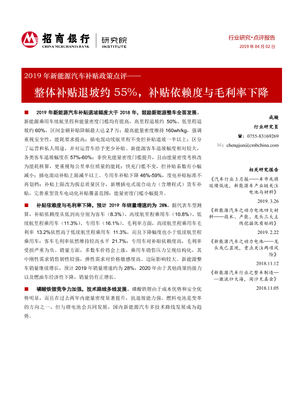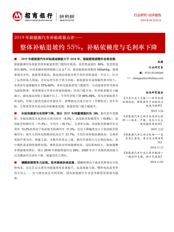 【招商银行】【20190402】2019年新能源汽车补贴政策点评:整体补贴退坡约55%,补贴依赖度与毛利率下降-14页