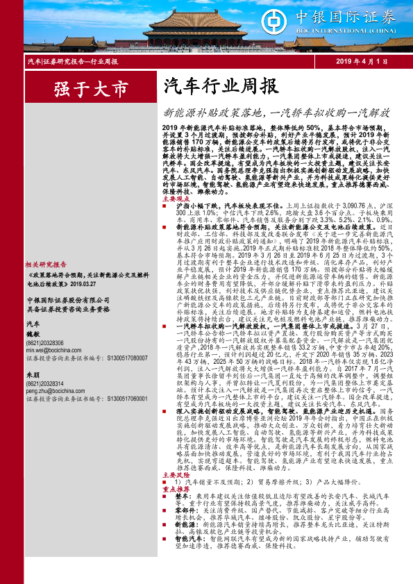 【中银证券】【20190401】20190401-中银证券-汽车行业周报:新能源补贴政策落地,一汽轿车拟收购一汽解放-19页