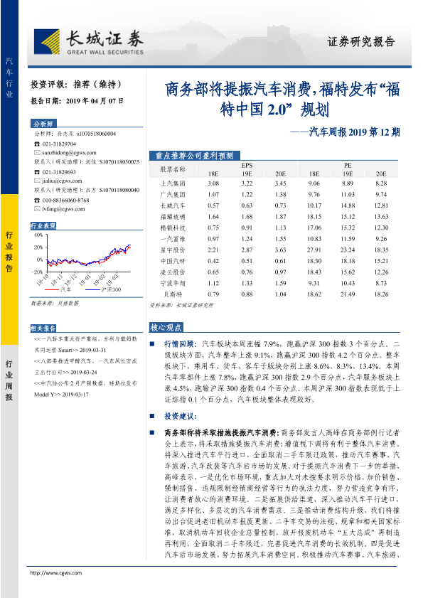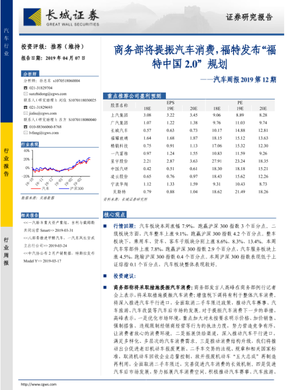 【长城证券】【20190407】汽车周报2019第12期:商务部将提振汽车消费,福特发布“福特中国2.0”规划-13页