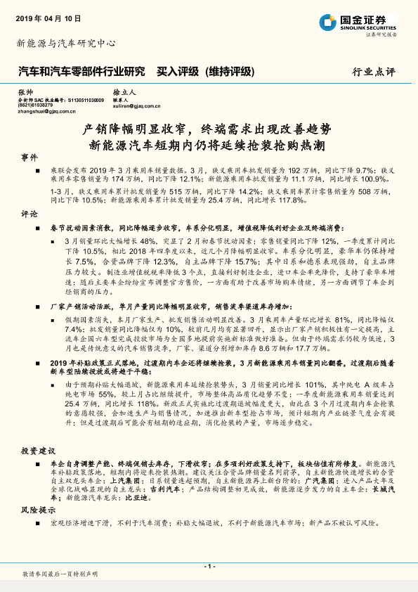 【国金证券】【20190410】汽车和汽车零部件行业研究:产销降幅明显收窄,终端需求出现改善趋势 新能源汽车短期内仍将延续抢装抢购热潮-4页