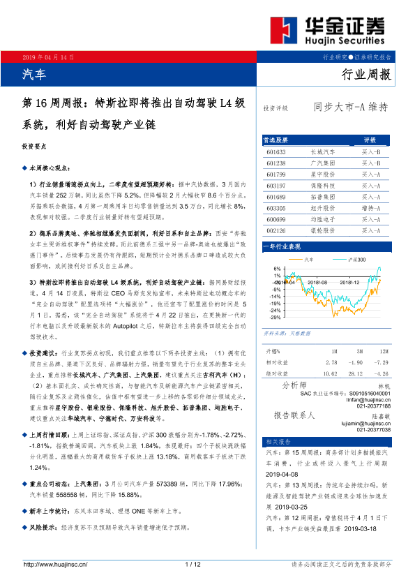 【华金证券】【20190414】汽车第16周周报:特斯拉即将推出自动驾驶L4级系统,利好自动驾驶产业链-12页