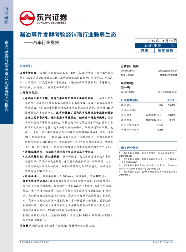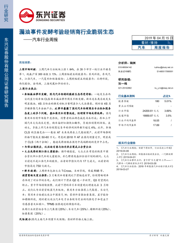 【东兴证券】【20190415】20190415-东兴证券-汽车行业周报:漏油事件发酵考验经销商行业脆弱生态-18页